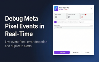 Meta Pixel Helper Pro es una extensión gratuita para Chrome diseñada para ayudar a marketers, desarrolladores y anunciantes a depurar eventos de Meta Pixel y Facebook Pixel en tiempo real. Permite visualizar cada evento en el momento en que se produce, incluyendo acciones como PageView, Purchase, y AddToCart, sin necesidad de actualizar la página. Además, proporciona un panel de estadísticas en vivo que muestra el total de eventos generados, la cantidad de píxeles activos, y cualquier error o evento duplicado detectado.